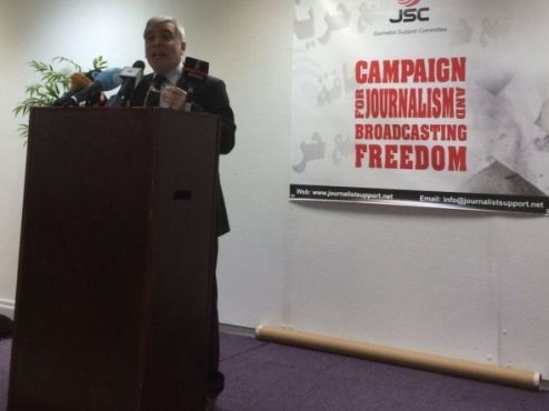 The campaign was attended by more than 25 journalists, who each addressed a speech in solidarity with freedom of the press and against the banning of broadcasting channels.