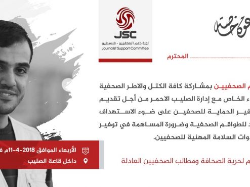 كما دعا نائب نقيب الصحفيين، الأستاذ تحسين الأسطل، إلى ضرورة توفير الحماية للصحفيين على ضوء القرار الاسرائيلي الرسمي من قبل وزير الأمن الاسرائيلي، أفيغدور ليبرمان، الذي هدد فيه باستهداف الصحفيين.