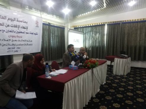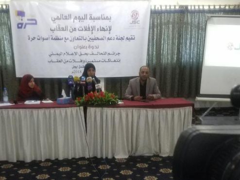 أقامت لجنة دعم الصحفيين بالتعاون مع منظمة أصوات حرة ندوة حوارية بمناسبة اليوم العالمي لإنهاء الإفلات من العقاب تحت عنوان: "جرائم التحالف بحق الإعلام اليمني...انتهاكات مستمرة وإفلات من العقاب"، وذلك يوم السبت الواقع في 3 نوفمبر/تشرين الثاني 2018.