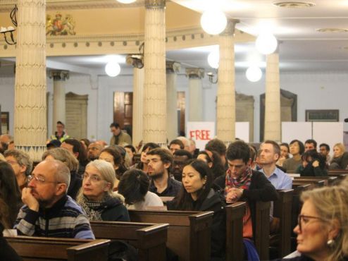 وكان من بين المتحدثين تحت عنوان "حرروا الحقيقة" مقرر الأمم المتحدة الخاص المعني بالتعذيب نيلز ميلزر، والسفير السابق للمملكة المتحدة كريج موراي، والصحفي المخضرم في التحقيق جون بيلجر.