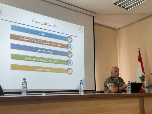تمحورت الندوة التي قدمها العقيد الركن زياد رزق الله مدير مديرية القانون الدولي الانساني وحقوق الانسان في الجيش اللبناني حول: القانون الدولي الإنساني وحماية الصحفيين خلال النزاعات المسلحة.