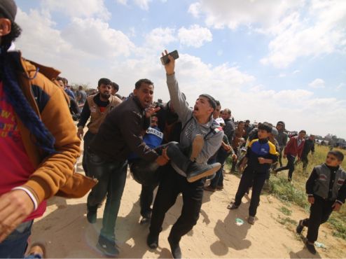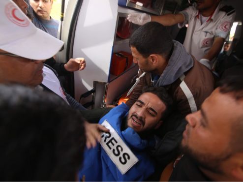 The Journalists Support Committee identified journalist Ahmed Muammar and journalist Ahmad Qafa as being shot by an Israeli sniper east of Khan Yunis in the southern Gaza Strip. Others were injured by asphyxiation due to gas inhalation, among the injured were journalist Mohammed Joudeh, Ashraf Abu Amra, Nivine Salim and Mohammed Al Kahlout.