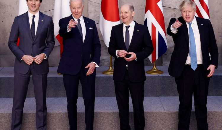 BRUSSELS, BELGIUM: US President Joe Biden and UK Prime Minister Boris Johnson pose for a G7 leaders family photo during a NATO summit on Russia's invasion of Ukraine, at the alliance's headquarters in Brussels, on March 24, 2022 in Brussels, Belgium. Both countries have introduced new mechanisms aimed at "debunking misinformation" about the Russian invasion [Henry Nicholls/Pool/Getty Images]