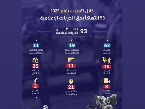 وبحسب تقرير اللجنة، فإن شهر أيلول/سبتمر2022 شهد أكثر من ( 63 ) انتهاكاً إسرائيلياً بحق الإعلاميين والتي تأتي في إطار محاولة القوات الاسرائيلية لطمس الحقيقة الساطعة لجرائمها التي تمارسها بحق الفلسطينيين، كما سجل التقرير ( 19 ) من الانتهاكات من قبل جهات فلسطينية داخلية، وبشأن محاربة المحتوى الفلسطيني سجل التقرير( 11 )حالة من الانتهاكات من قبل مواقع التواصل الاجتماعي.